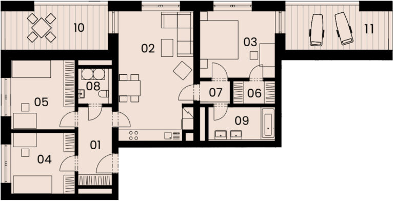 Poznámka: Plochy jednotlivých místností jsou pouze orientační. Vyobrazený nábytek a kuchyňská linka ani spotřebiče nejsou součástí bytu. Zobrazené formátování povrchu podlah je pouze grafický symbol.