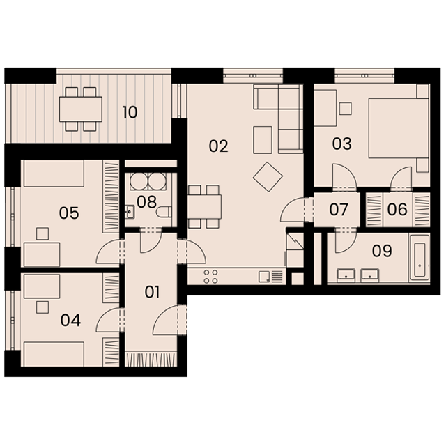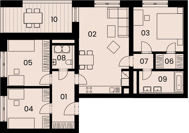 Poznámka: Plochy jednotlivých místností jsou pouze orientační. Vyobrazený nábytek a kuchyňská linka ani spotřebiče nejsou součástí bytu. Zobrazené formátování povrchu podlah je pouze grafický symbol.