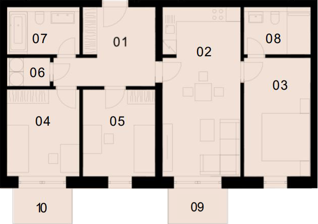Poznámka: Plochy jednotlivých místností jsou pouze orientační. Vyobrazený nábytek a kuchyňská linka ani spotřebiče nejsou součástí bytu. Zobrazené formátování povrchu podlah je pouze grafický symbol.