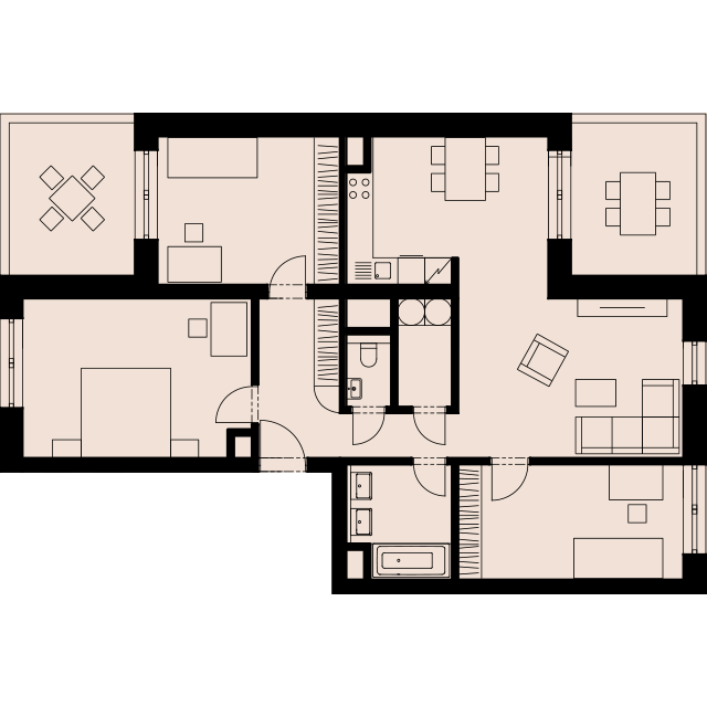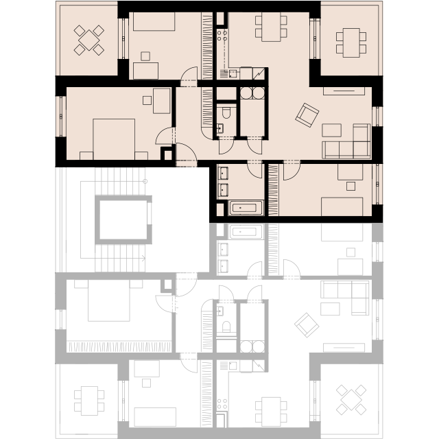 Poznámka: Plochy jednotlivých místností jsou pouze orientační. Vyobrazený nábytek a kuchyňská linka ani spotřebiče nejsou součástí bytu. Zobrazené formátování povrchu podlah je pouze grafický symbol.